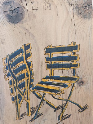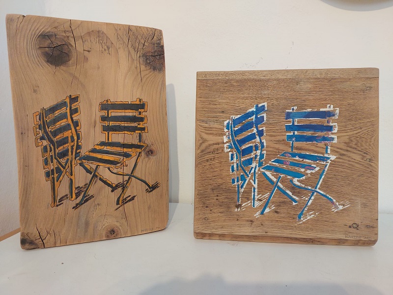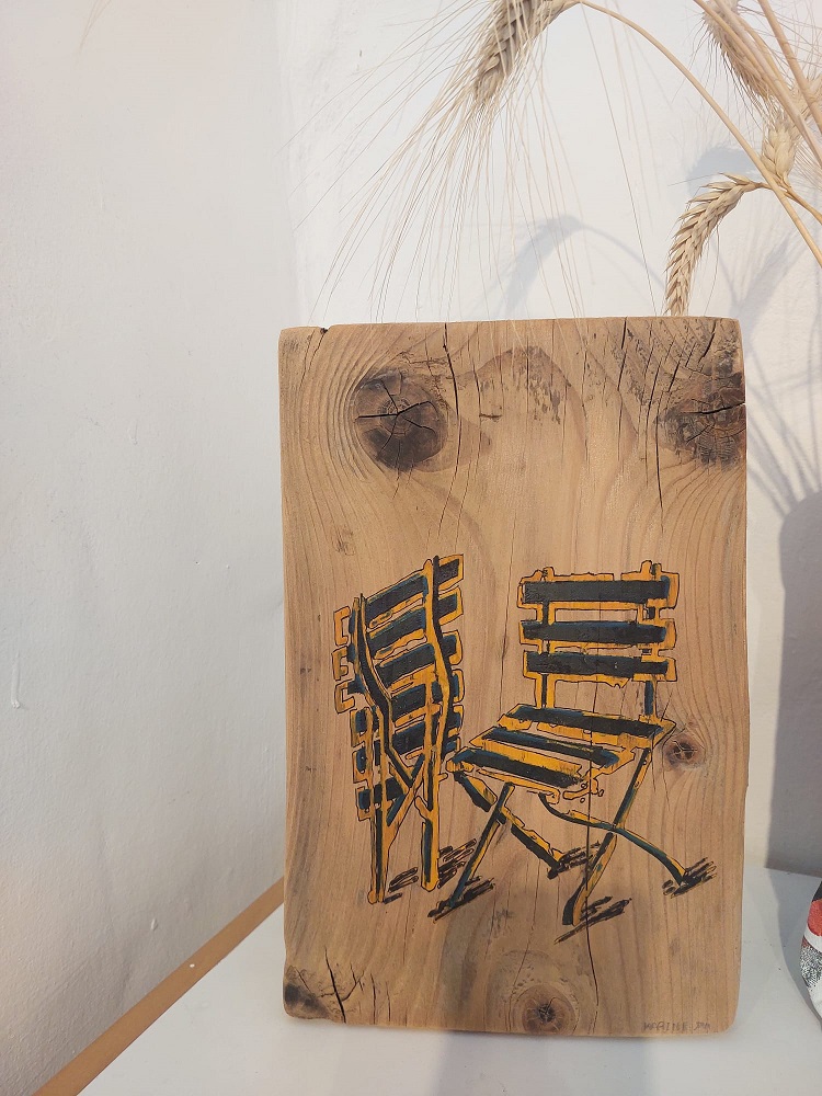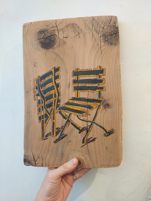כסאות, ציור מקורי על עץ של האמנית קרין ינקורט