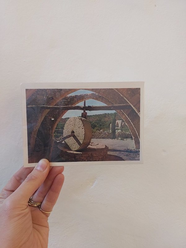 וגלויה של בית הבד העתיק, משנות השישים המוקדמות (ככל הנראה) בעיצוב מדליק עם ניחוחות וינטג'