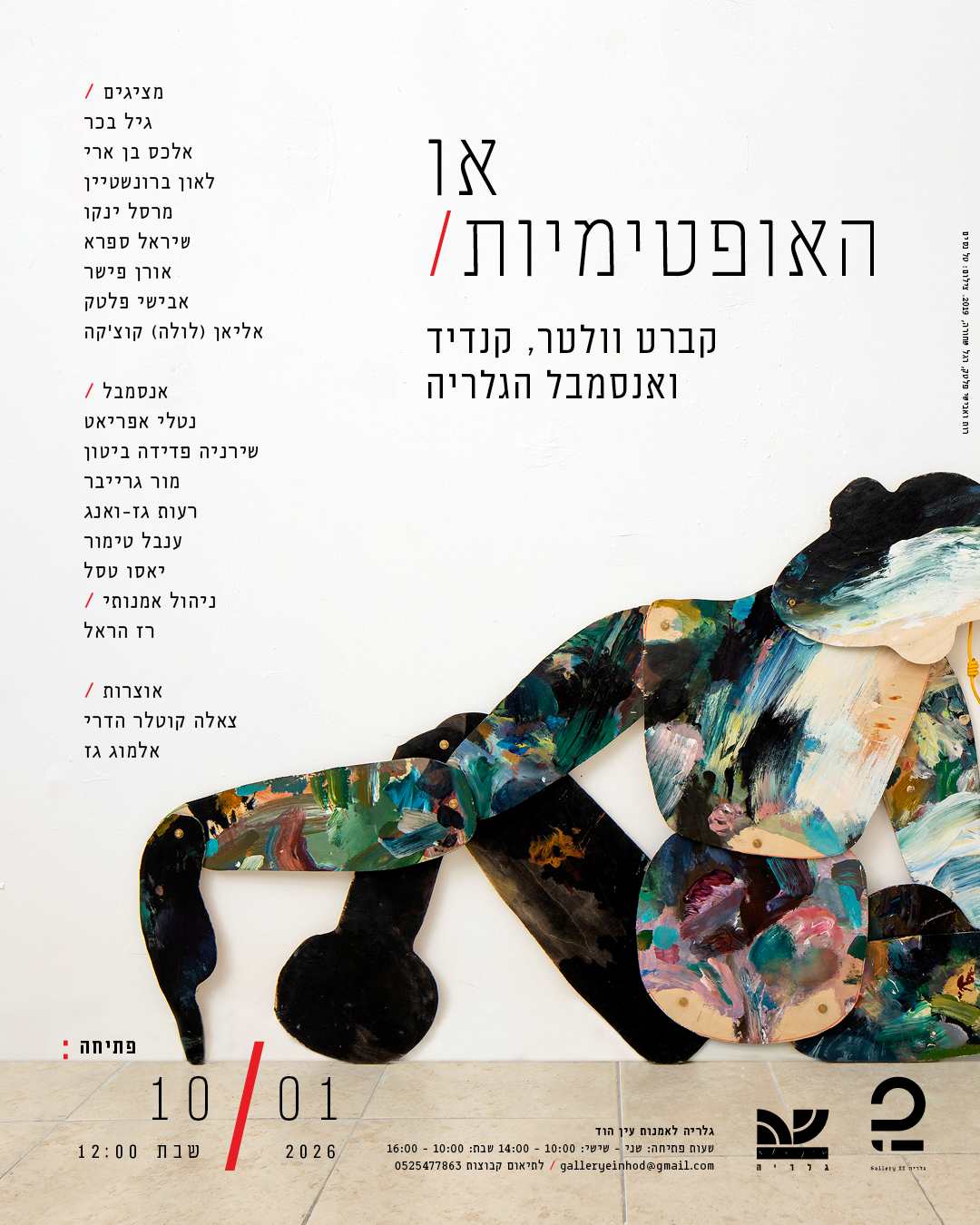 ׳סיור מודרך ואימפרוביזציה בגלריה׳ הוא אירוע מיוחד המשלב סיור מודרך ותנועה חופשית בחלל התערוכה המרכזית באגף לאמנות עכשווית בגלריה עין הוד, "או האופטימיות: קברט וולטר, קנדיד ואנסמבל הגלריה", אוצרות: צאלה קוטלר הדרי ואלמוג גז. התערוכה משלבת אמנות פלסטית יחד עם פעולה פרפורמטיבית, ומציעה קרקע לתגובה חיה ליצירות המוצגות בתערוכה.