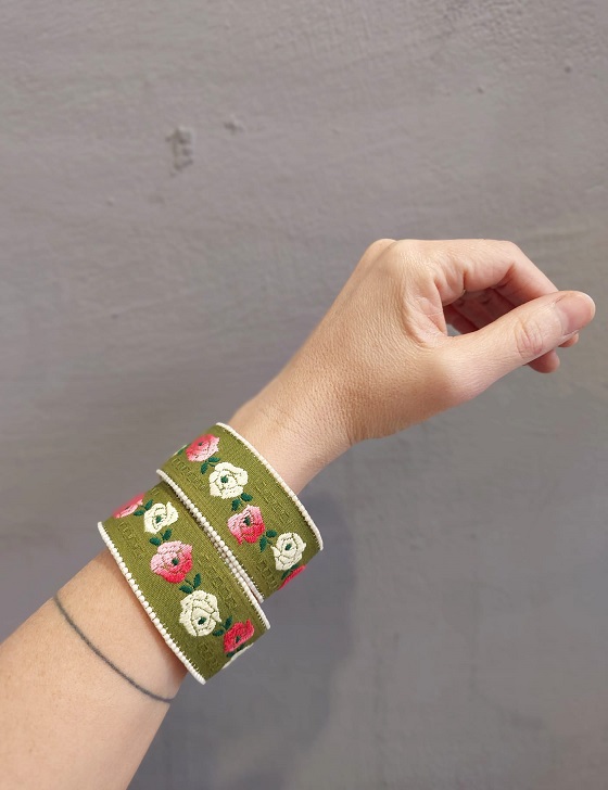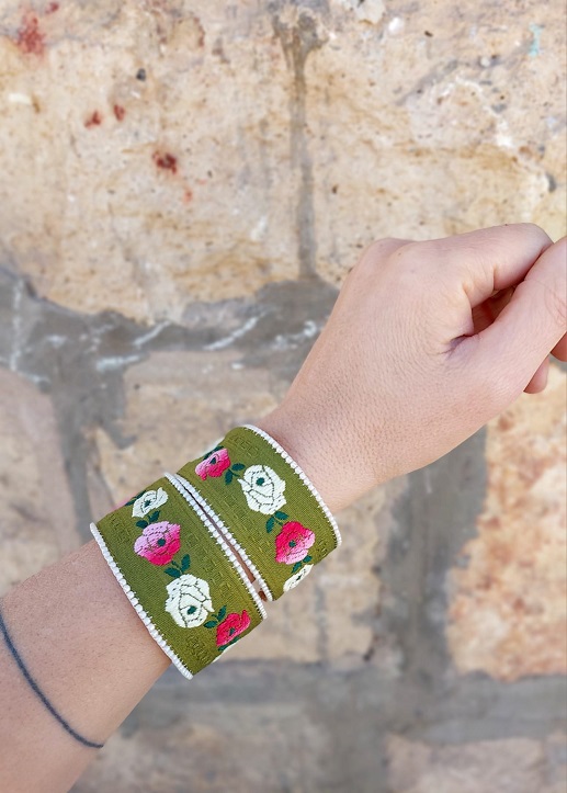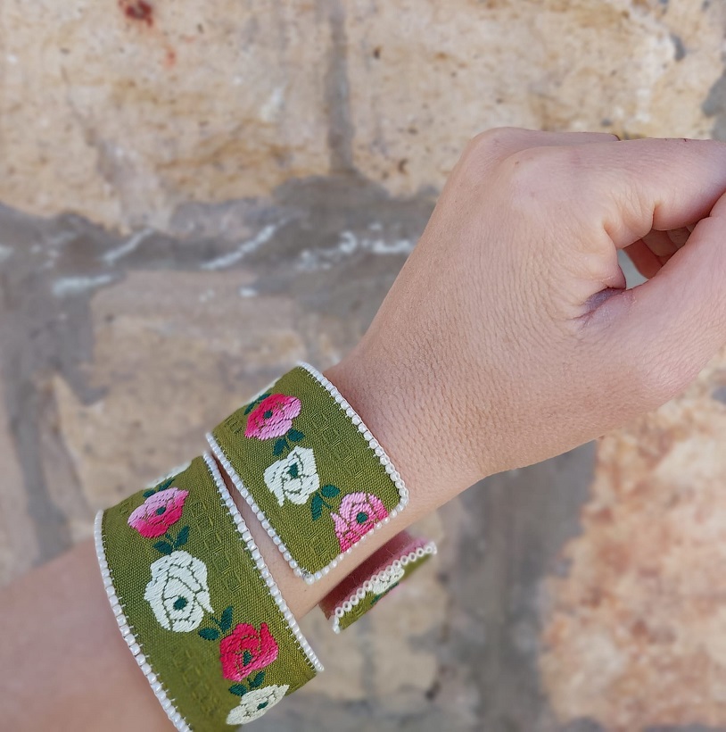 מסביב לרקמה- תפורים בעבודת יד חרוזים. מתחת לרקמה יש פליז רך, שמאפשר לצמיד גמישות, כך שיוכל להתכוונן לפי הגודל הרצוי.