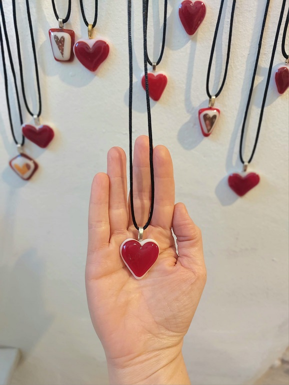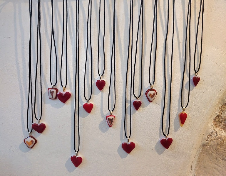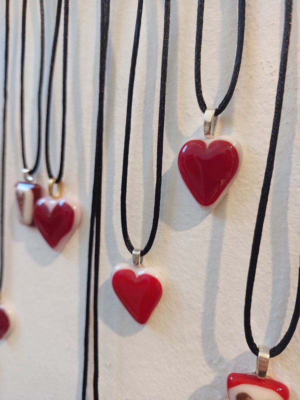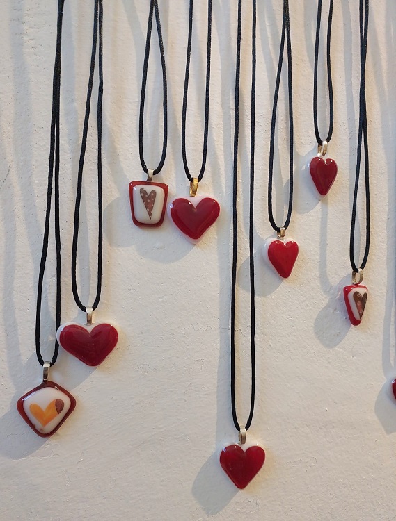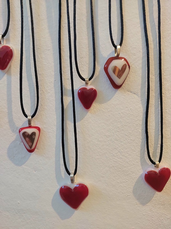 תיוני לב מזכוכית בטכניקת פיוז'ן של אמן הזכוכית בוב נצ'ין.
